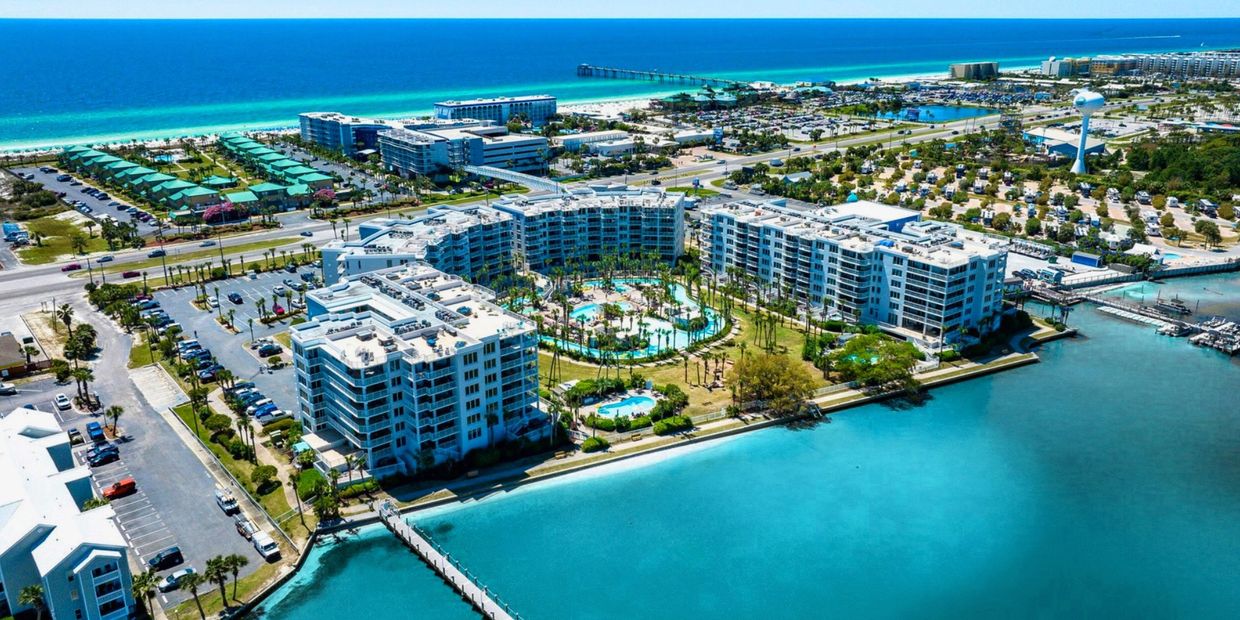 Destin West Beach & Bay Resort is a vibrant, resort style property located on Okaloosa Island in Fort Walton Beach, Florida. The resort stretches from the sugar white sands of the Gulf of Mexico to the calm, sparkling waters of the Choctawhatchee Bay. Set on beautiful Okaloosa Island, the resort feels like its own tropical village, full of color, water features, and lush landscaping that instantly puts guests in vacation mode.